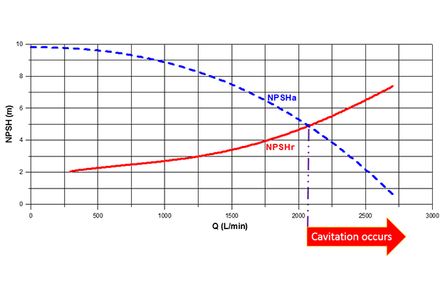 NPSH is used to determine if cavitation will occur during operation. If NPSHa is greater than NPSHr, then cavitation will not happen. If NPSHa is smaller than NPSHr, then cavitation is expected (see diagram). For practical purposes, to prevent cavitation from occuring, we usually introduce a safety margin by making sure at the desired flow rate, the NPSHa>NPSHr+0.5 m.