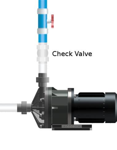 In a positive suction system, we need to make sure the air inside the suction system has the means to escape. In the following system (Fig. 2), the discharge piping has a check valve. If pressure is present above the check valve, the air within the pump cannot escape. To solve this problem, a priming valve needs to be installed for the air to escape. In Figure 3, the priming valve is installed under the pressure gauge. The section of tubing leads back to the suction tank, effectively a bypass system. Make sure the end of the tubing is not submerged in the liquid, which would prevent effective venting of the air.