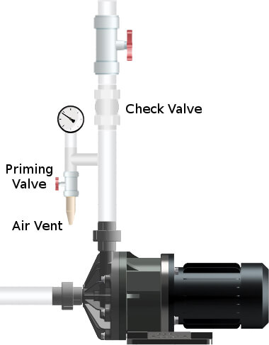 Make sure the suction piping has a foot valve or a check valve so that the liquid does not drain back to the suction tank during priming or when the pump is stopped. There should also be a priming piping at the discharge of the pump (see Figure 5).