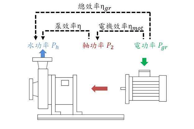 總效率是泵浦輸出水功率與輸入電功率的比值。